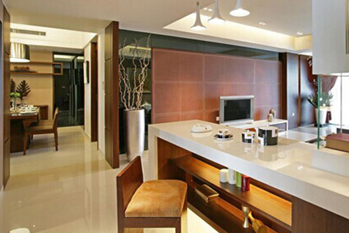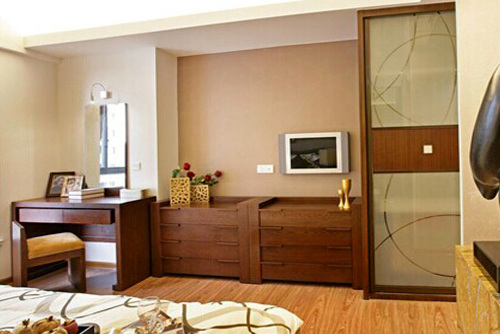 既完善整個(gè)空間的功能性,并且具備儲(chǔ)物展示功能.電視背景墻采用皮質(zhì)軟包,給人親近的質(zhì)感,并且對(duì)聲音有很好的發(fā)散,而整個(gè)家居的色調(diào)采用淺棕色,配合現(xiàn)代中式的家具,形成一種獨(dú)特的文化積淀.
